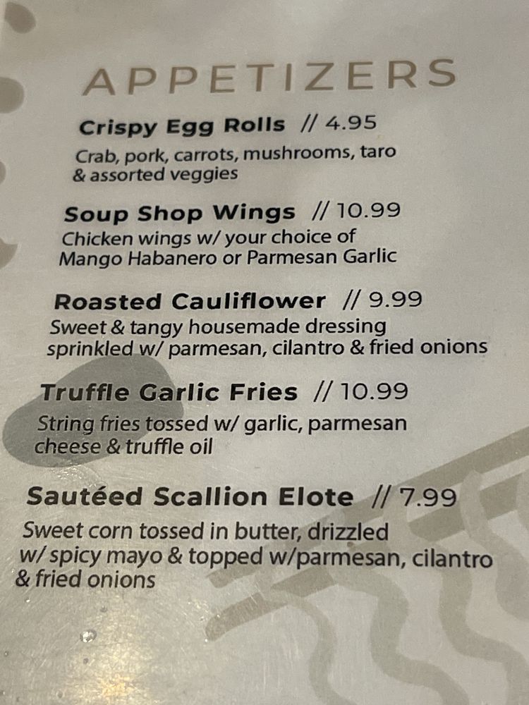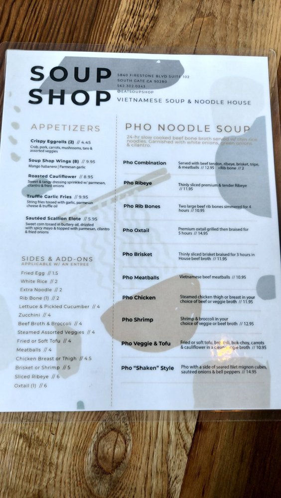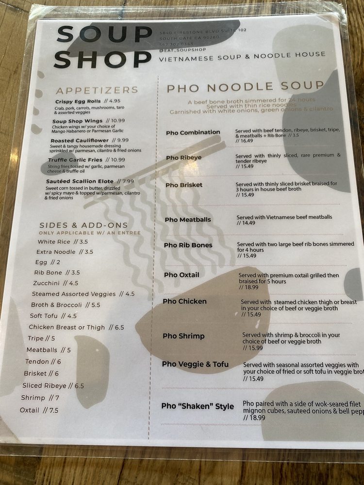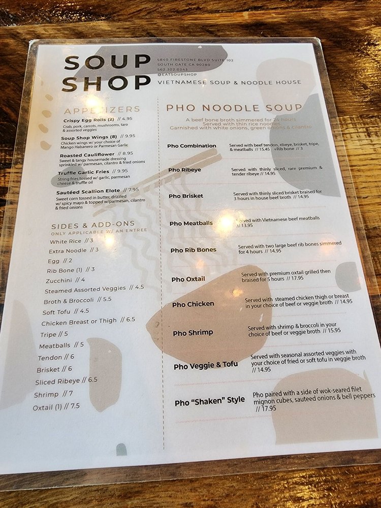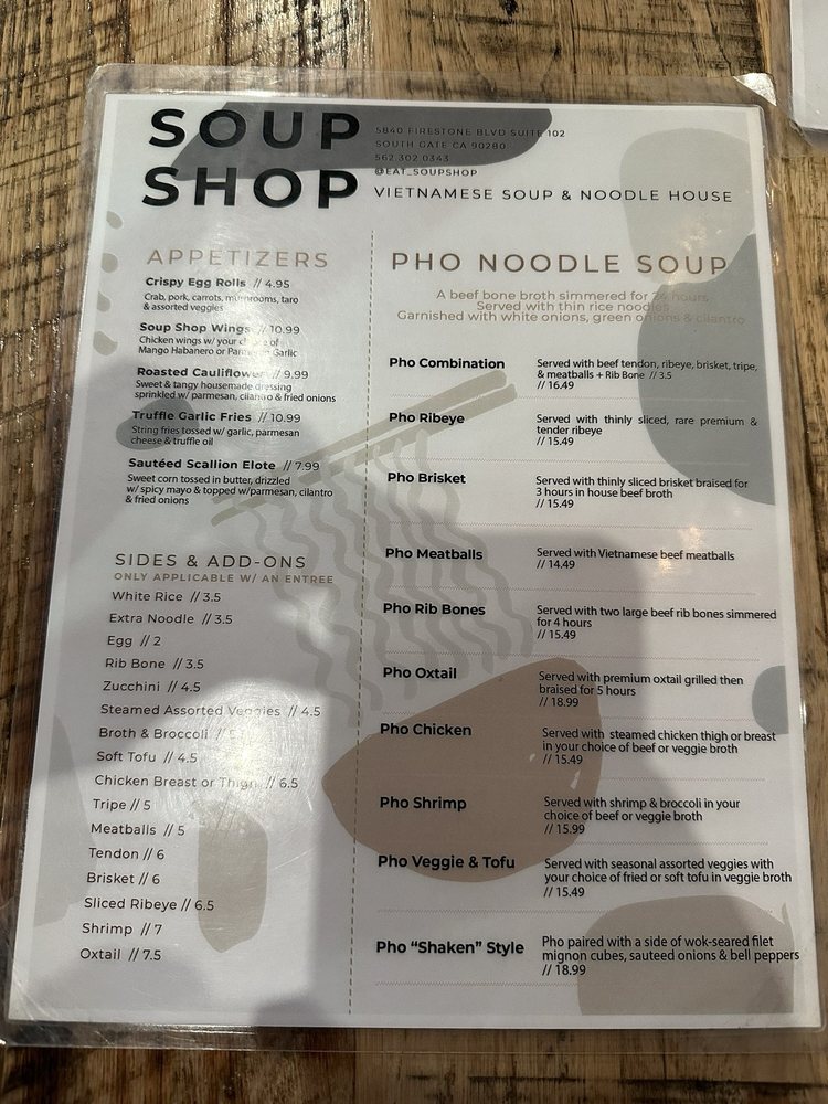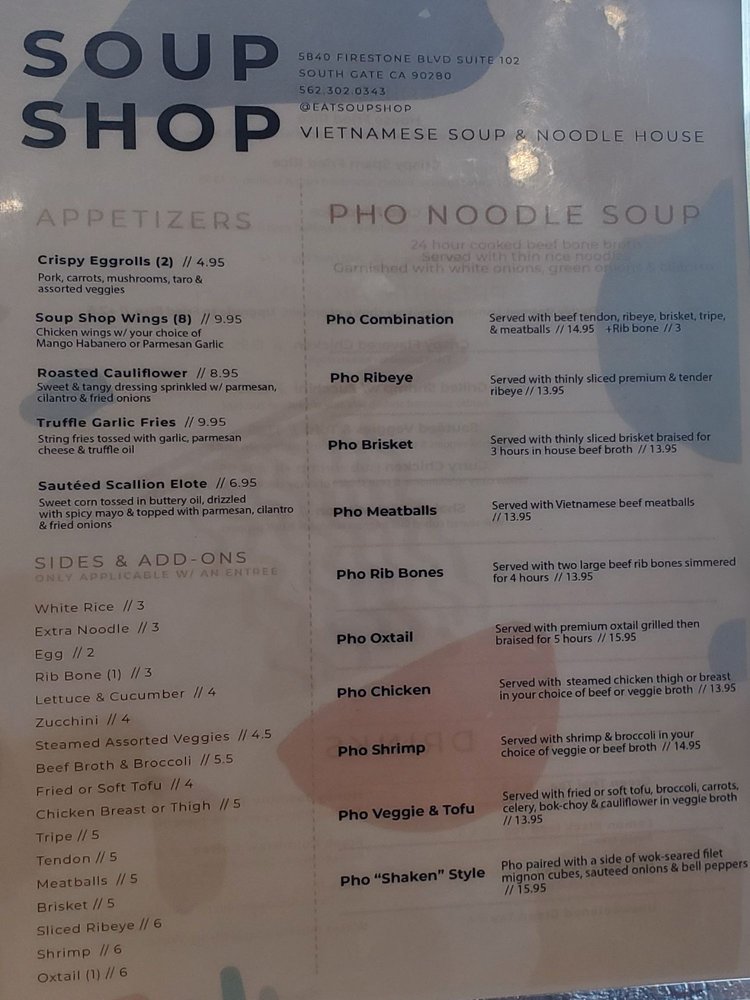 Soup Shop, located in South Gate, CA, offers a delightful Vietnamese soup experience. With options like Chicken Fried Rice, Crab Fried Rice, and House Fried Rice, the menu is full of flavorful choices. The Crispy Egg Rolls appetizer is a must-try, while the Pho selection, including Pho Brisket and Pho Combination, is a highlight. Customers praise the quality of the dishes, such as the killer pho and delicious shrimp fried rice. The ambience is described as cute and ideal for a date night. Despite some initial hiccups with availability, the service is attentive, making for an overall enjoyable dining experience. Whether you're a fan of soup or looking to try something new, Soup Shop is a must-visit spot that promises a satisfying meal.